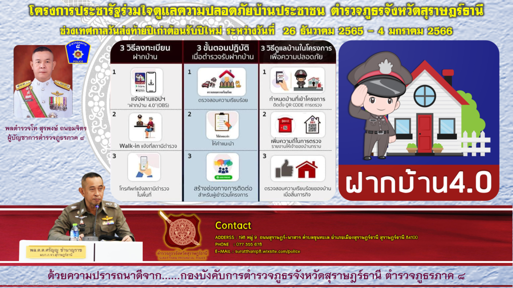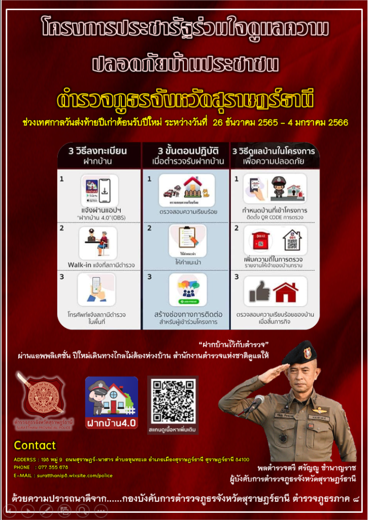 สภ.เคียนซา ภ.จว.สุราษฎร์ธานี รับฝากบ้านช่วงเทศกาลปีใหม่ 2566 โทร 07738711